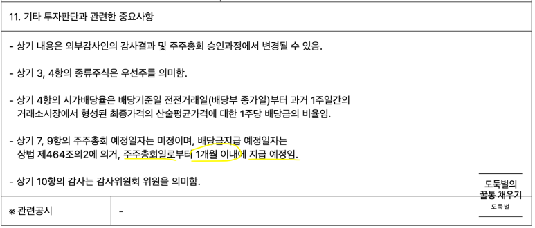 11. 중요사항 : 주주총회일로부터 1개월 이내 지급 예정